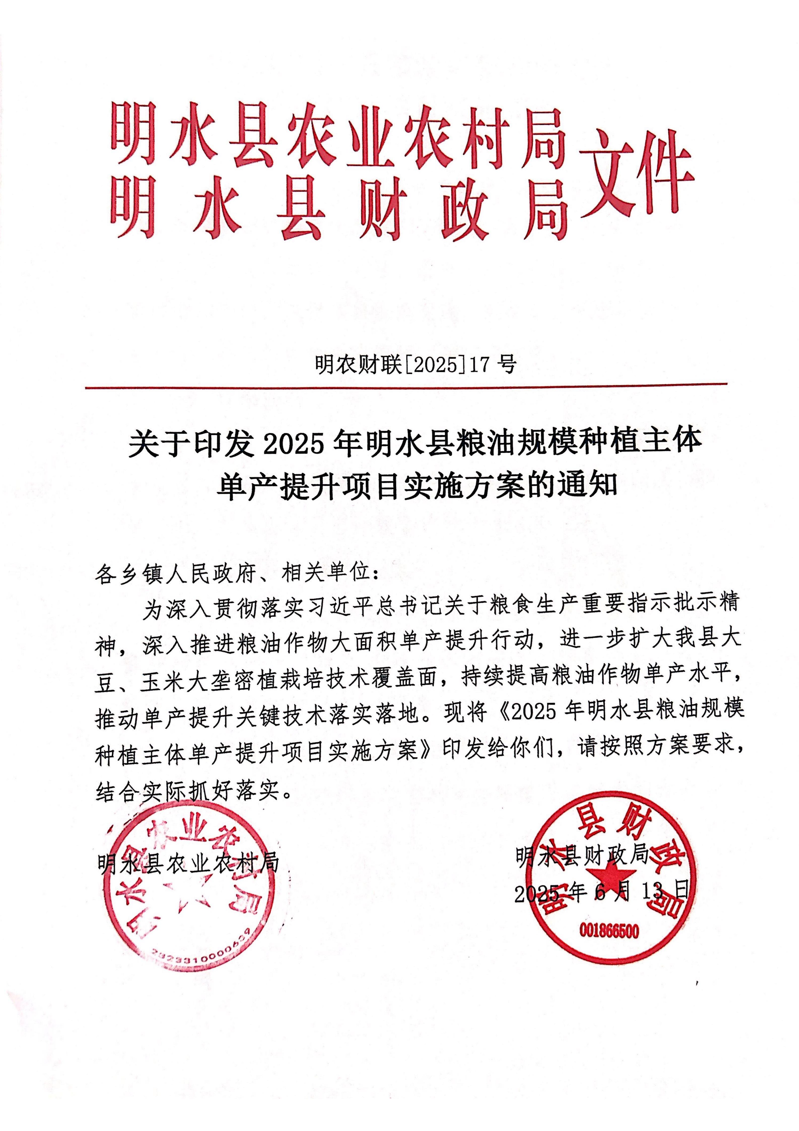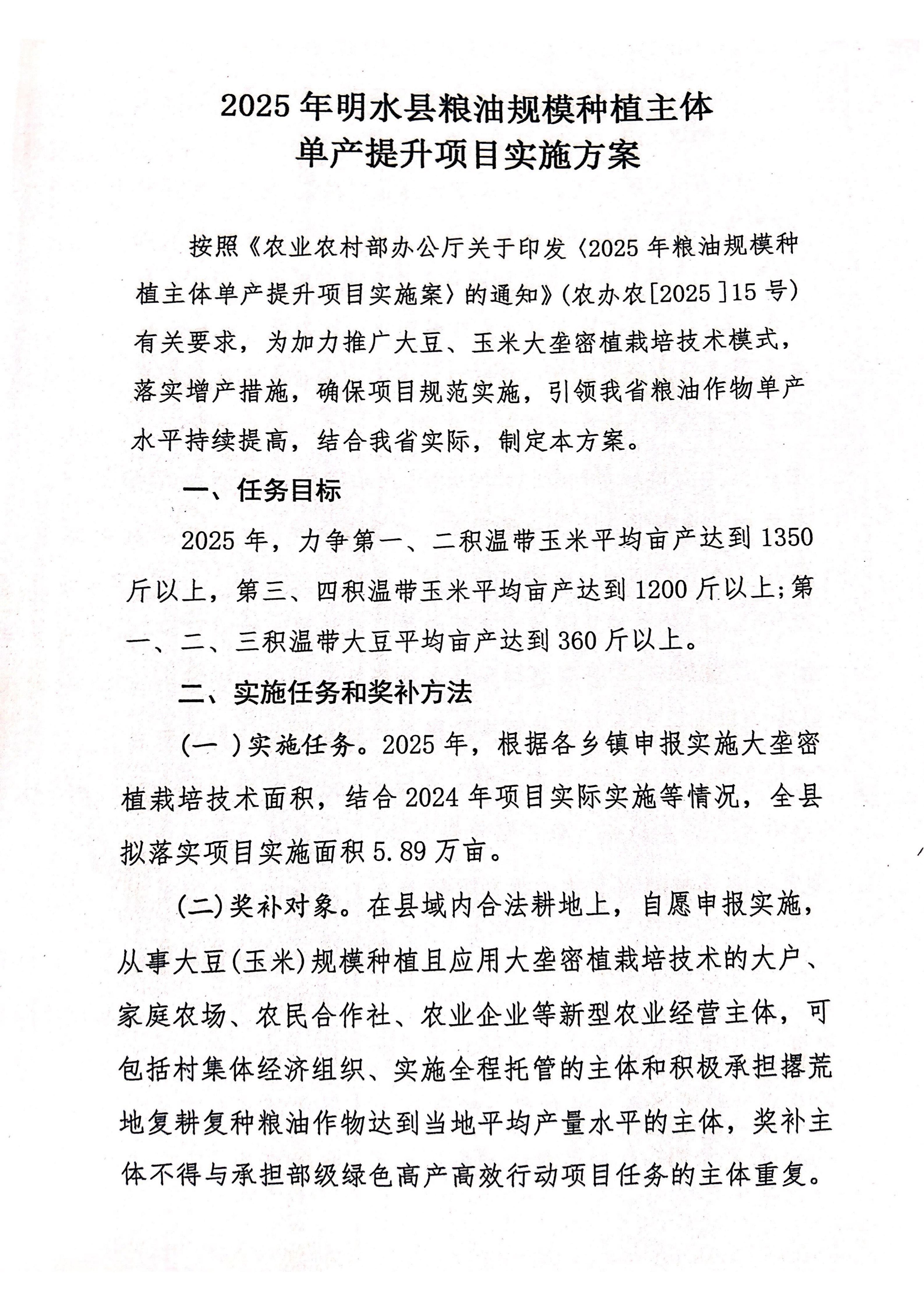 2025年明水县粮油规模种植主体单产提升项目实施方案