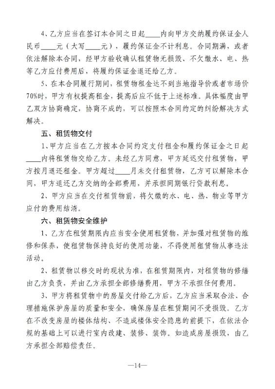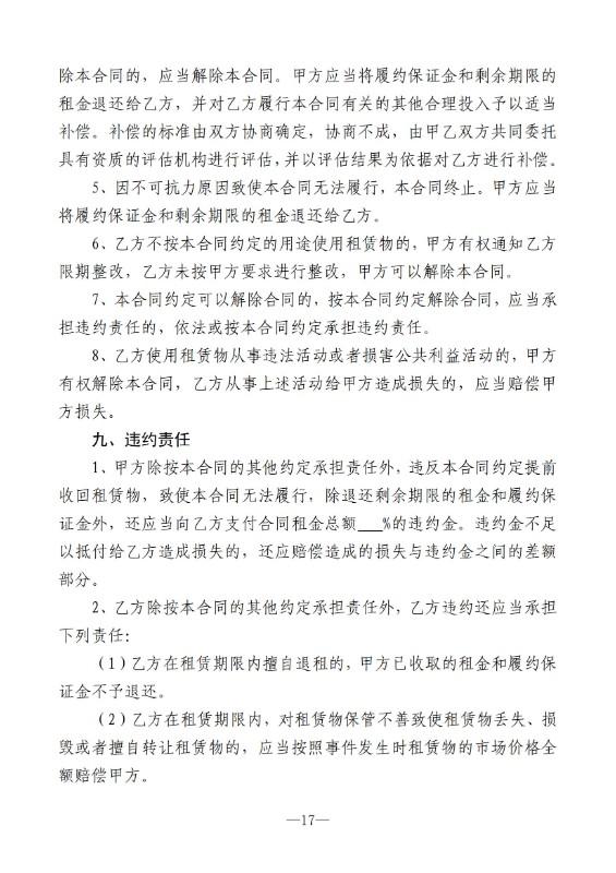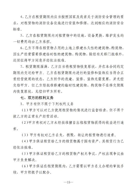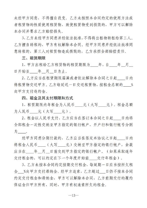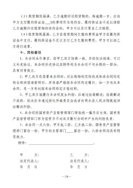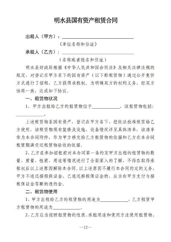 (四)资产出租单位按成交价格与承租人签订出租合同。合同应载明:租赁期限、资产使用范围、租金、租金交付时限、双方的权利与义务及违约责任条款等,出租合同文本格式由县国有资产管理办公室统一制定。