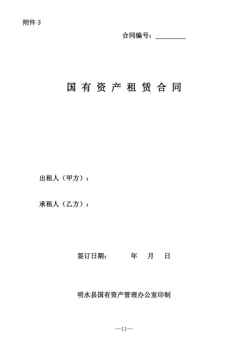 第十一条 国有资产出租要按规定履行资产出租审批手续,未经审批,任何部门、单位、国有企业不得擅自出租国有资产,确需出租的国有资产,经审批同意后,原则上采取公开招租的形式,由国有资产占有单位委托公开媒介对有关信息进行公开招租。意向承租方报名填写《明水县国有资产承租登记表》(附件2),按照相关程序获得租赁权后与出租单位签订租赁合同,签订租赁合同时,要统一使用县国有资产管理办公室制定的租赁合同规范文本《国有资产租赁合同》(附件3),租赁期限一般为1—3年,最多不得超过5年,特殊情况须报经主管部门审核、县国有资产管理办公室审批后方可适当延长调整。