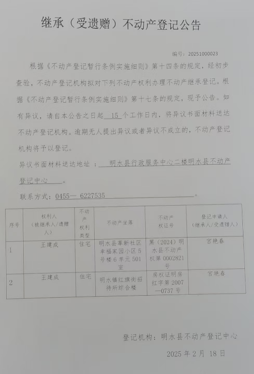 继承不动产登记公告(宫艳春)