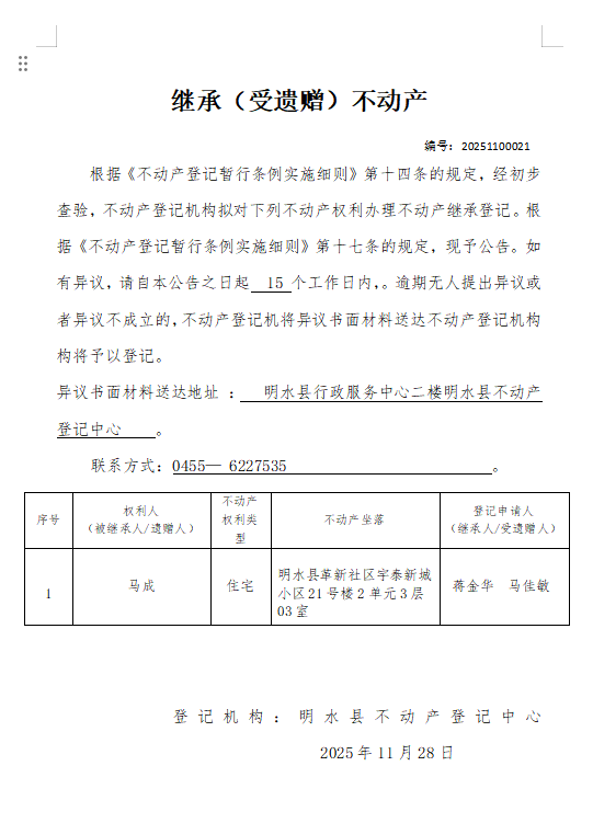 继承不动产登记公告(蒋金华、马佳敏)